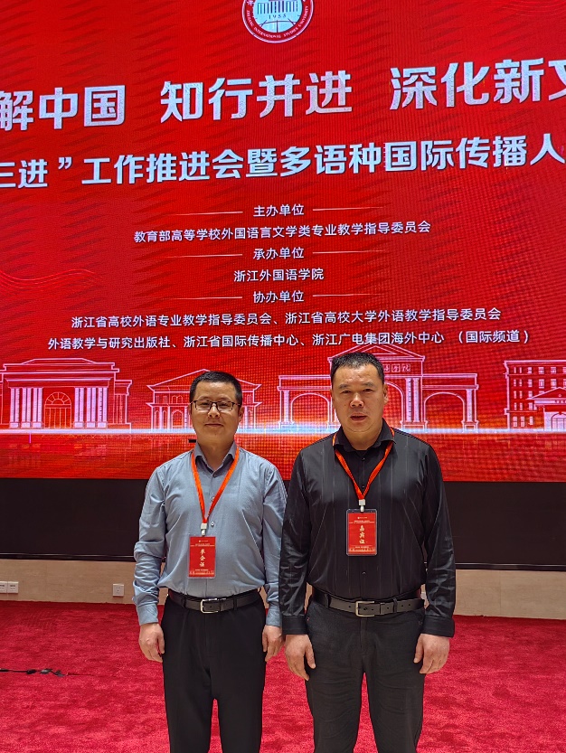 4月11日,华东地区“三进”工作推进会暨多语种国际传播人才培养研讨会在浙江永利yl23411集团举行。教育部高等学校外国语言文学类专业教学指导委员会主任委员、北京外国语大学孙有中教授,教育部高等学校大学外语教学指导委员会主任委员、浙江大学何莲珍教授,教育部高等学校大学外语教学指导委员会委员、电子科技大学胡杰辉教授,中新社浙江分社副社长严格,杭州市商务局党组成员、杭州自贸片区管委会专职副主任武长虹,以及来自华东地区高校外语界的专家、浙江省市政府部门代表、企业家代表、媒体代表等百余人现场参会,全国高校外语院系负责人及骨干教师近3000人线上参会。永利yl23411集团院长洪常春率卫欣老师参加会议。