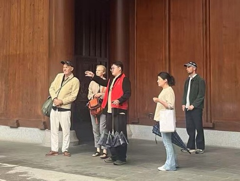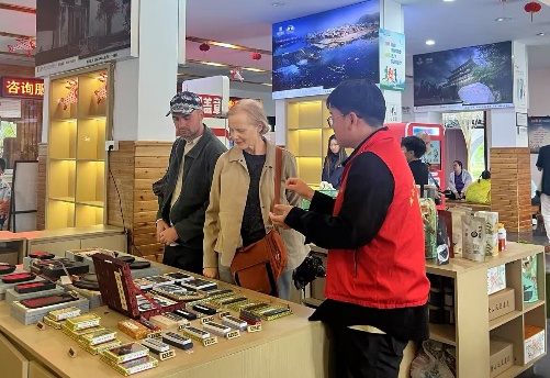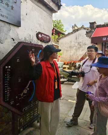 活动以“语言+文旅”为核心特色,结合景区需求灵活分配任务:从服务内容来看,呈坎组的同学全员参加了景区讲解实践,服务游客104人次,得到了切实的讲解技能上的锻炼。22级英语的张超同学为3名来徽州古城游览的外国游客提供了全程英语讲解服务,展现了大学生的外语优势与跨文化交流能力,得到了游客的好评。其他景区因自有讲解员较多,或因假期外籍游客数量较少,对讲解服务的需求有限,服务重点转向引导咨询、文创销售、秩序维护等保障性工作。从服务游客数量来看,西递组的杨欣悦、于恬恬和杨玉璐均以约300人次的服务量表现突出。