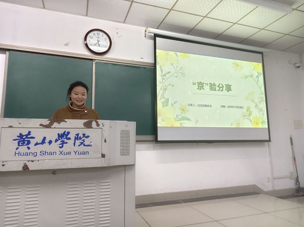22级英语专业鲍京京以“‘京’验分享”为主题,展示了个人在英语专业领域的各类证书与荣誉,彰显专业实力。随后,她围绕英语导游证备考,从报名流程、考试科目、备考策略等方面进行详细讲解,为有相关职业规划需求的学生提供了清晰的备考路径。