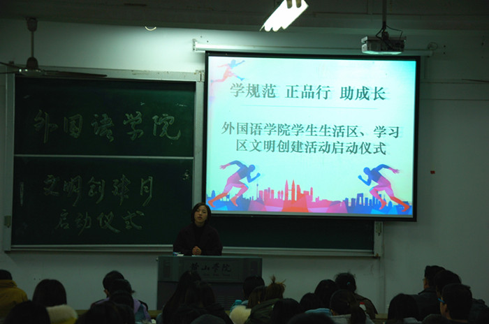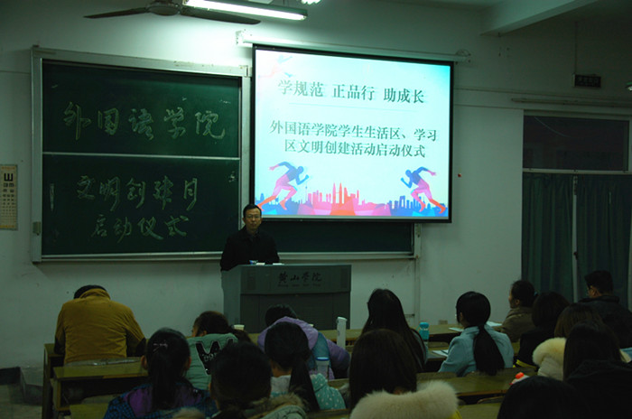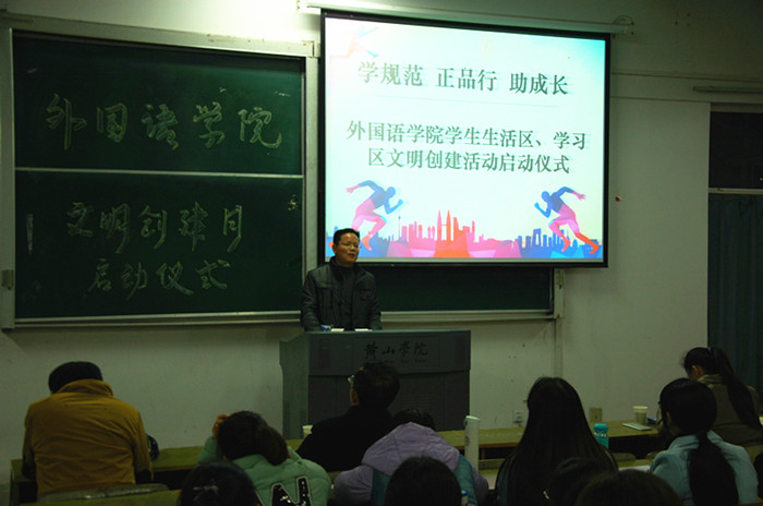 11月28日下午,永利yl23411集团在外语楼多媒体一教室举行“学生生活区、学习区”文明创建活动启动仪式。永利yl23411集团院长黄立华、党总支副书记王国平以及专兼职辅导员出席,各班班长、团支书、寝室长和部分学生代表参与了此次启动仪式。会议由院团总支负责人王琦主持。