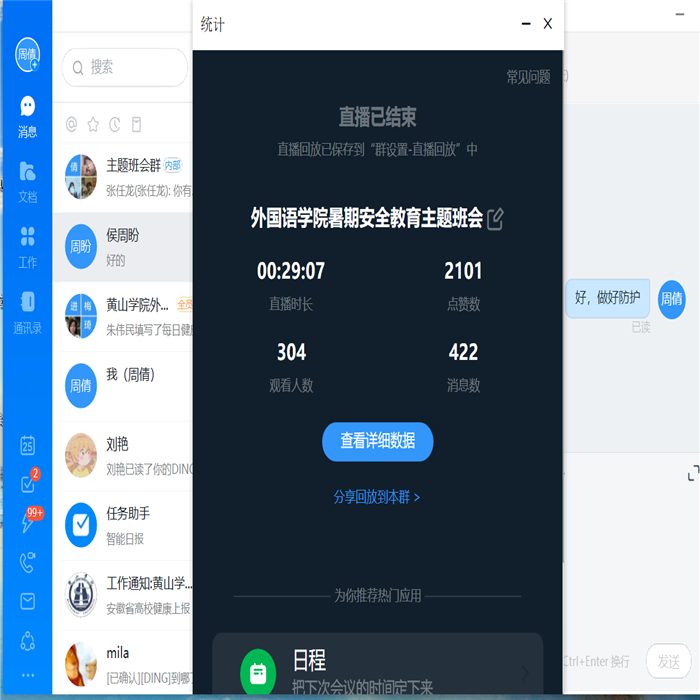 该院各年级班级辅导员通过钉钉平台,召开了线上暑期安全教育主题班会。班会围绕户外安全、防灾减灾、不良网贷、网络诈骗、预防传销和禁毒教育等六个方面展开,其中重点强调疫情防控的问题,提出要坚持疫情防控常态化,同时提醒学生尽量避免去疫情高风险地区,减少不必要出行;并就钉钉填报、社会实践等问题提出要求;最后,辅导员要求同学们在暑假期间认真学习、努力备考、合理规划。