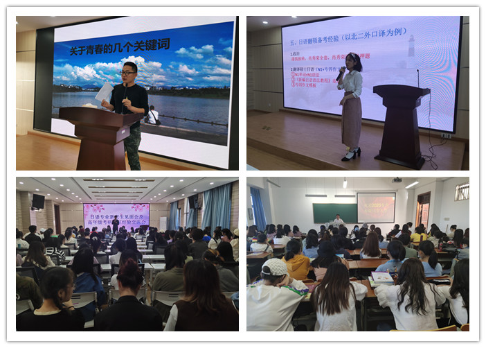 会上,三名优秀考研生依次分享了自己的考研经验和心路历程,包括如何选择考研方向和院校、如何制定计划、如何查询资料等方面。曾海东同学通过线上视频的方式向同学们介绍了跨专业考研的经历和技巧经验。他围绕考研专业推荐、考研准备时间、试题难度、如何缓解压力和提高学习效率、如何择校五个方面谈论了自己的亲身经历和感受。日语专业的俞也老师就日语翻译硕士方向、院校选择和考试科目等方面进行分享。金香花老师就渡日后的发展可能性、渡日途径以及具体方法三个方面向我们分享了她的经验。现场提问环节,在场的同学和老师对现场学生提出的问题一一进行解答。