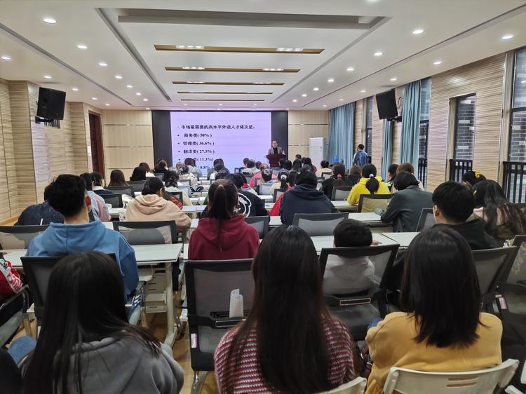 周平首先介绍了近几年商务英语发展势头迅猛的原因。他指出,社会对商务类外语人才的大量需求、全球化进程加快等因素,推动了商务英语的飞速发展。其次,周平向同学们讲解了商务英语的内涵,并从学习商务英语需要培养的知识、能力以及素质方面提出了三点建议:一是要培养概括总结知识的能力;二是要在学习过程中用批判的眼光看问题,敢于发现问题、解决问题;三是要善于沟通,将语言学习应用到生活当中。通过此次讲座,同学们加深了对商务英语的认识,也更加明确了未来的学习方向。