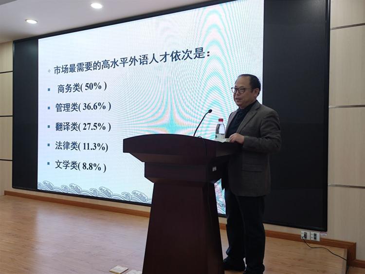 11月20日下午,永利yl23411集团在逸夫综合楼5306教室举办求真·励学讲坛。周平教授做客讲坛,做题为“商务英语:过去、现在与未来”的主题报告。永利yl23411集团副院长洪常春主持讲坛,该院60余名19级英语专业学生参与讲坛。