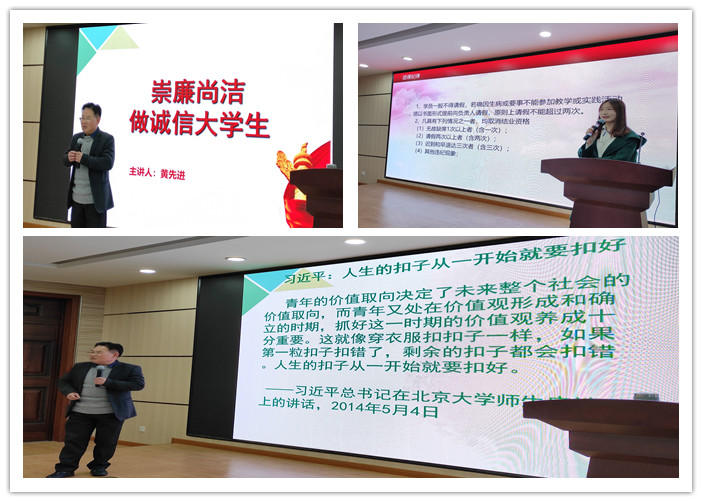 永利yl23411集团党委书记、院长黄先进作为主讲人,做“崇廉尚洁、做诚信大学生”的廉洁教育讲座。黄先进讲述了党中央对于廉洁的要求:要把权力关进制度的笼子里,形成不敢腐的惩戒机制、不能腐的防范机制、不易腐的保障机制。此外,黄先进从四个“需要”强调了大学生廉洁教育的重要性:大学生廉洁教育是高校人才培养的需要、是高校廉政文化建设的需要、是构建和谐社会的需要以及是弘扬中华民族传统美德的需要。黄先进指出,考试舞弊、论文抄袭、骗取或恶意拖欠国家助学贷款、毕业生就业诚信缺失、部分学生干部行为失范和生活奢侈浪费都是大学生不廉洁修身的具体表现。他提出大学生应树立廉洁的风尚和品格,向廉洁高尚的榜样学习,并不断提高自身的思想道德修养。随后,黄先进阐述了十九大释放的八大重磅反腐信号。