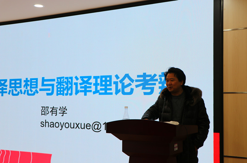 邵有学追溯了翻译思想研究形成的沿革,重点分析了“翻译思想”在中国的萌芽、发展、繁盛的三个时期;并从词典的定义、专业辞典的定义、广义和狭义的“翻译思想”三个方面辨析和界定了翻译思想和翻译理论的概念。他提出翻译思想研究不仅要包括有代表性的翻译家个人的思想,还要注重描述影响一个时代翻译活动、群体理论研究的思想潮流;翻译思想的研究包括决定翻译理论研究取向、指导翻译策略选择的个体内在价值观和翻译活动的历史决定因素这两个方面。邵教授随后分享了撰写《翻译思想与翻译理论考辨》论文的经历,并赠予学院其本人学术专著《中国翻译思想史新论》。该报告专业性、学术性很强,在与会人员中产生了强烈的反响。