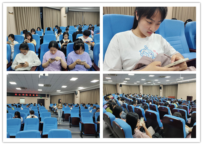 本次比赛形式新颖,学生在手机端登陆“词达人”平台进行线上答题。在大赛开始前,监考老师根据进入省赛参赛名单对参赛者进行身份证比对,比对无误的考生在签到表上签字。在监考老师的指导下,考生在线签署“诚信竞赛承诺书”后进入答题环节。在比赛过程中,同学们专心致志、沉着冷静,比赛现场井然有序。