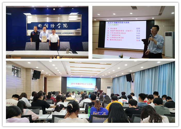 讲座开始前,王敏教授向永利yl23411集团赠送了他精心准备的礼物:《浙江通志——外事志》。讲座伊始,王敏教授以幽默风趣口吻,用日语法语韩语三国语言问候同学们,使现场的氛围顿时热烈起来。随后,他详细讲解了日语的发音口腔部位及发音特点、翻译时容易陷入的误区及从事外事翻译等工作时,需要具备的“外事翻译的基本素质与技能”。在讲解发音时,王敏教授请两位同学当场朗读了教材课文选段并称赞她们发音标准流利,并向参与互动的同学赠予书籍以示鼓励。在学习技巧上,他提出“超前学习”的建议,从学习、考研、恋爱、求职等侧面,形象地说明了“超前做”的重要性,强调实现“超前”需要大量输入、海量阅读,应多读原著,主动学习。他建议在主动学习吸收经典文学等知识的过程中,要学习文化精髓,以此指引自己的人生道路,最后达到精准锁定人生努力的目标方向。人无论处在哪个阶段,都应该注重思考。特此,王敏教授为大家讲述了自己的外语经历及一些有趣的外事故事,并鼓励在场的同学们:不停地学习、思考、探索,并付诸实践。随后,王敏教授亲自翻译并用日文演唱安徽家乡戏曲《天仙配》,获得学生们的热烈鼓掌。最后,他对同学们提出的困惑给出了宝贵的意见和建议。讲座结束后,同学们纷纷表示受益匪浅。20日语王钰说:“王敏老师的讲座融合外语学习、工作、生活、人生感悟于一体。这次讲座着实使我受益匪浅,王敏老师的学识修养、发音水平和专业知识都给我留下了深刻的印象,作为日语专业的学生,我们都应该按照王敏老师所传授的那样,定好目标、超前学习。”