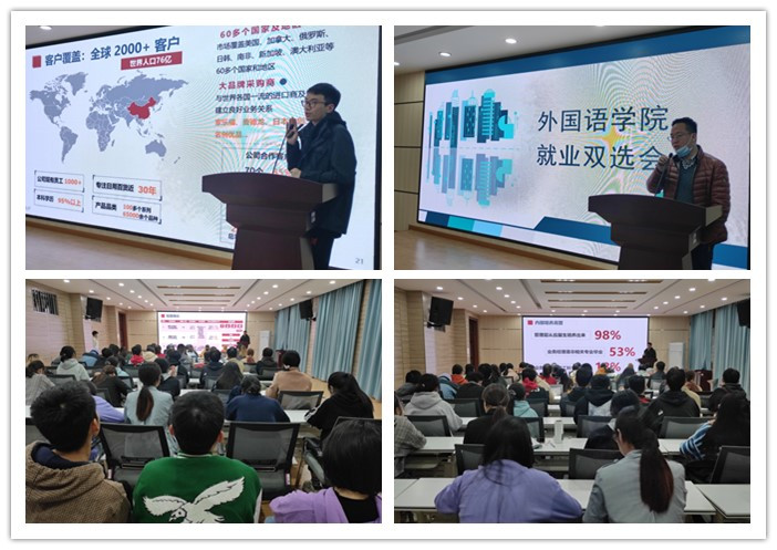 洪常春就目前就业情况对毕业生们提出建议,要求毕业生把握机会,珍惜机遇。宁波亚虎进出口有限公司和黄山万丽美油墨科技有限公司两家单位进行宣讲。单位负责人分别介绍公司情况。亚虎公司负责人在外贸行业的情况、实习生入门计划、公司氛围、薪资情况等进行了全方位说明。黄山万丽美油墨科技有限公司的负责人对公司的主要产品、发展历程、企业文化及公司前景进行了介绍。