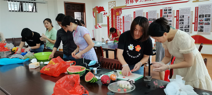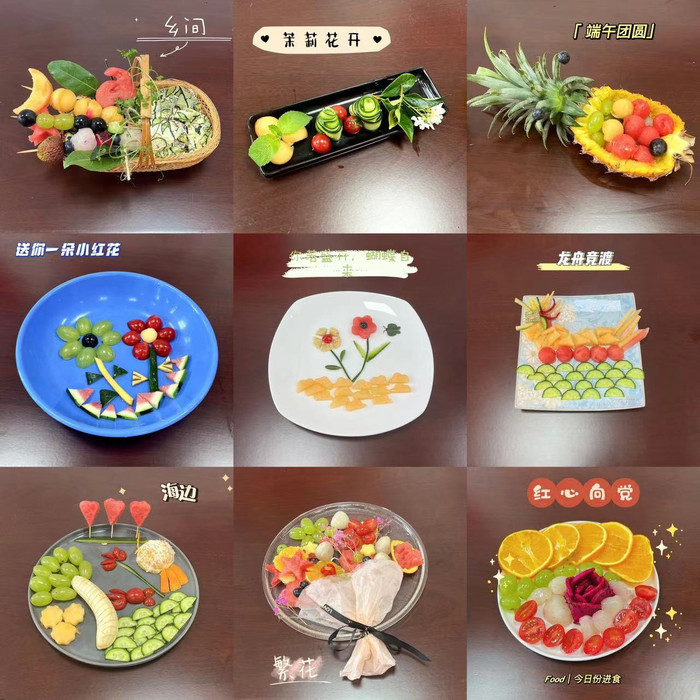 活动在热闹祥和的氛围中拉开帷幕,女教师们两两一组,共同开动脑筋,发挥创意和合作精神,完成了一幅幅精雕细琢的水果拼盘作品。由火龙果、甜橙和圣女果等制成的“红心向党”造型独具特色,深情满满;作品“端午团圆”“龙舟竞渡”展现了端午节浓厚的民俗和风情;“茉莉花开”“乡间”“繁花”“海边”“送你一朵小红花”“你若盛开,蝴蝶自来”等作品则展现了初夏的繁花美景和对美好生活的向往。