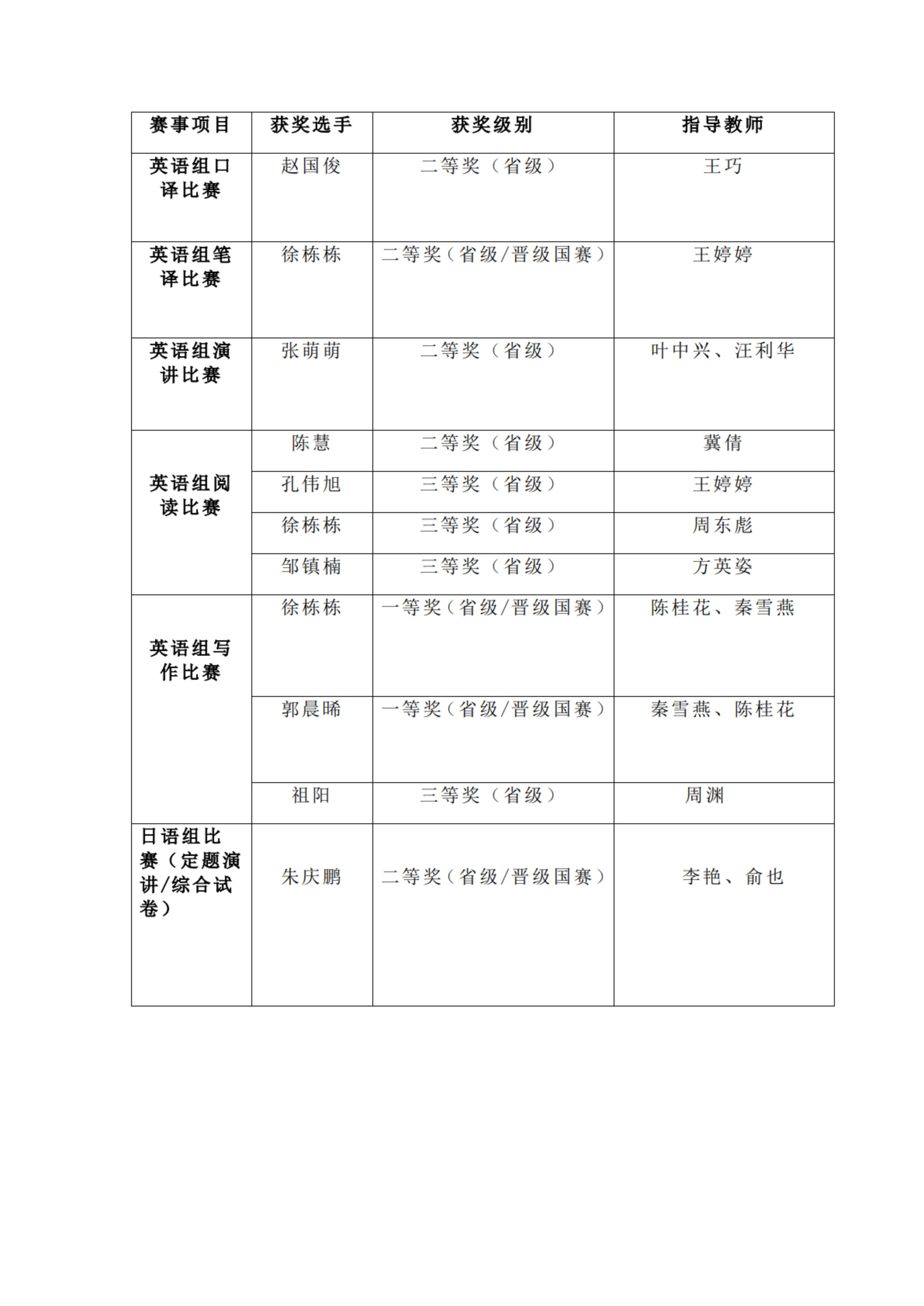 大赛英语组分设演讲、写作、阅读、笔译和口译五大赛事项目,另外还开设多语种比赛项目。我校永利yl23411集团学生参加了线上和线下赛项,参赛选手精心备赛,指导教师悉心教导,取得历史最佳成绩。其中一等奖2名,二等奖5名,三等奖4名,共有4名选手晋级国赛。