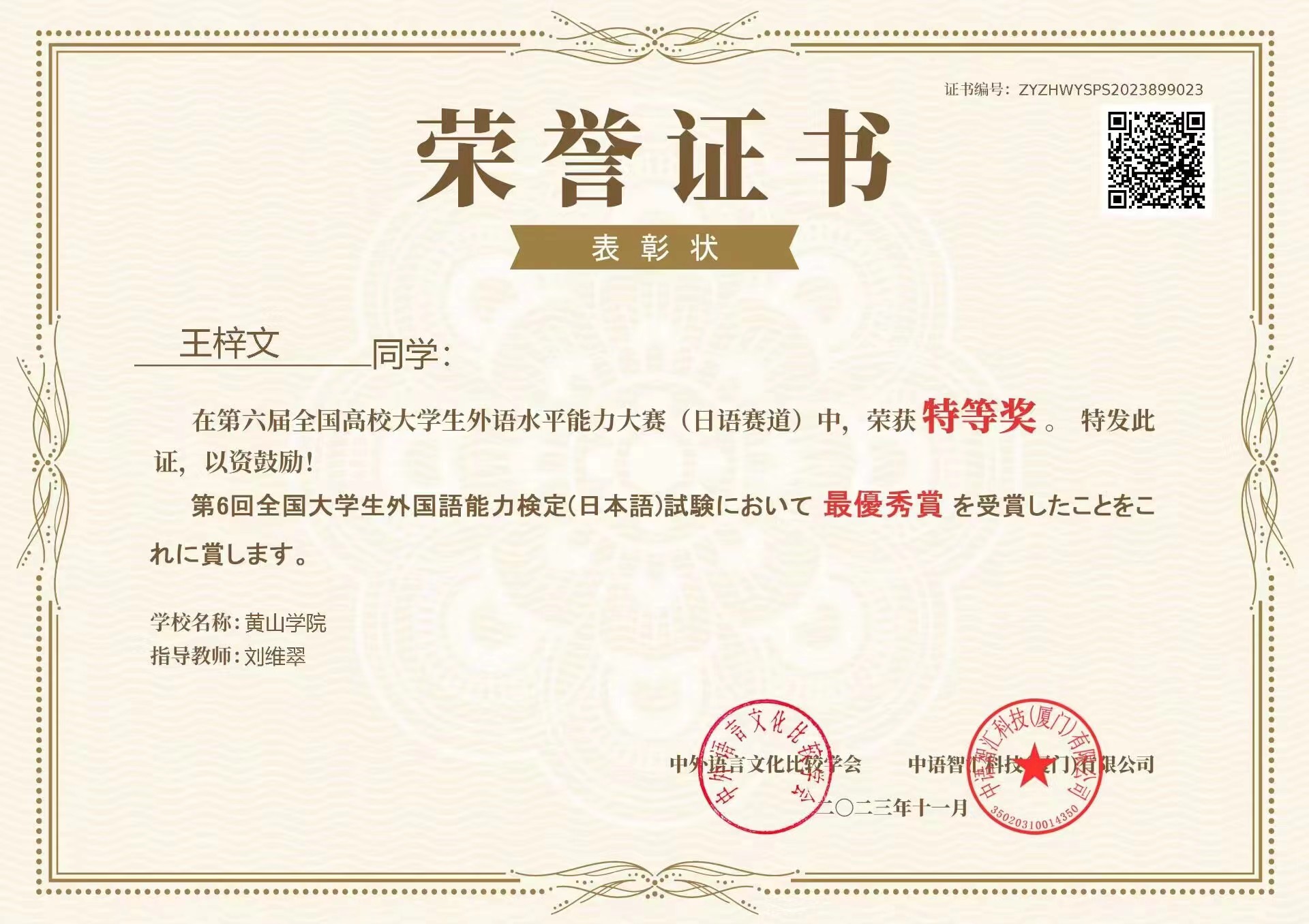 本次比赛由中外语言文化比较学会主办,中语智汇科技(厦门)有限公司承办。初赛、决赛均通过登录官方指定的平台进行参赛,比赛成绩由平台大数据分析并自动产生排名。此次共有来自日语专业、日语辅修专业和大学日语学生共52位同学参加校内初选赛。最终来自永利yl23411集团21日语1班赵湘琳同学、吴逸飞同学、21日语2班康倩影同学、21日语辅修班霍然同学和22日语1班的王梓文、22日语2班李超同学在校内选拔赛中胜出并代表yl23411集团参加决赛,并在决赛中表现出色,全部获奖。