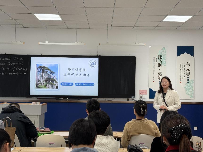 11月12日下午,永利yl23411集团在5201智慧教室举办示范课教学观摩活动。永利yl23411集团教师周渊以“用英语讲好中国绿色发展的故事”为主题,呈现了一堂融合AI赋能、思政引领及成果导向的大学英语创新示范课。观摩活动由副院长周东彪主持,学院领导及全体教师参加观摩活动。