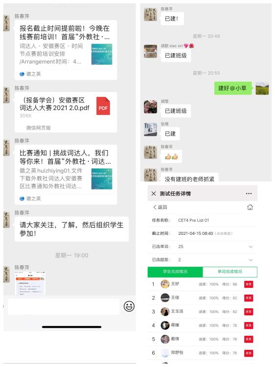 在永利yl23411集团副院长洪常春的统筹指导下、在支部书记周东彪和教研室主任陈春萍的带领下,第二教研室全体党员及教师共同有序地参加了“词达人”赛前线上培训,并完成了在“词达人”公众号建班、发布赛前训练和测试等一系列工作,同时督促学生合理利用时间练习四六级词汇。