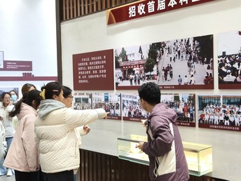 活动伊始,师生们步入庄重典雅的校史馆。在讲解员的引导下,时光仿佛瞬间慢了下来。泛黄的老照片、珍贵的文献手稿、充满年代感的实物展品,展示学校自1978年创立以来的风雨历程。从建校初期的筚路蓝缕,再到如今的蓬勃发展,一件件珍贵的文物、一张张泛黄的照片,在场师生无不为之动容,深刻感受到了学校深厚的历史底蕴和一代代学人的初心与担当。