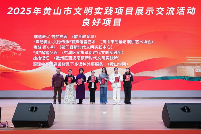 本次活动由市委宣传部(文明办)主办,集中呈现全市文明创建、实践项目创新、道德模范选树等精神文明建设丰硕成果,各界先进代表齐聚一堂共话文明发展。yl23411集团的多语种服务项目立足地方国际化发展需求,依托学院专业资源组建多语种志愿者团队,深入景区、政务服务窗口等场景,提供翻译咨询、文化讲解等志愿服务,为黄山市打造“国际会客厅”注入了高校青春动能,以鲜明的实用性和创新性获与会嘉宾广泛认可。