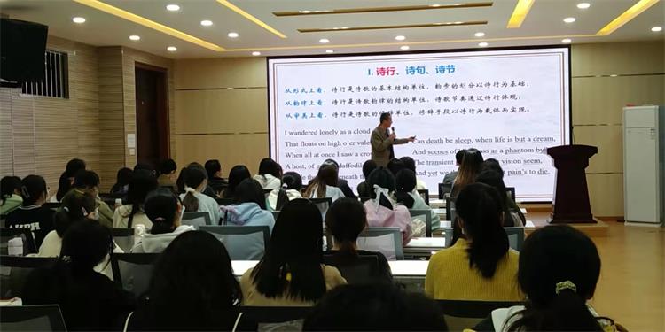 王任傅旁征博引,并通过大段背诵中英文诗歌,帮助同学们更好地理解有关内容,展现了丰富的知识和深厚的文学素养。他鼓励同学们说,英语诗歌的欣赏并不是很困难的事情,掌握诗歌内在韵律特点、语法规则和基本的朗诵技巧,大家都能成为优秀的诗歌欣赏者和朗读者。
