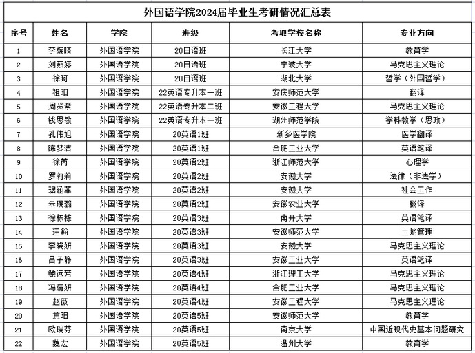永利yl23411集团2018届毕业生考研情况汇总表 | 序号 | 姓名 | 学院 | 班级 | 考取学校名称 | 专业方向 | 陈雪 | 永利yl23411集团 | 14英语1班 | 安徽师范大学 | 英语(学科教育) | 1 | 汤敏 | 永利yl23411集团 | 14英语1班 | 首都师范大学 | 英语(学科教育) | 2 | 鲍远鑫 | 永利yl23411集团 | 14英语1班 | 天津理工大学 | 英语笔译 | 3 | 陈珍 | 永利yl23411集团 | 14英语1班 | 安徽师范大学 | 学科教学(英语) | 4 | 滕康鑫 | 永利yl23411集团 | 14英语2班 | 上海海事大学 | 法律硕士(非法学) | 5 | 汪慧娟 | 永利yl23411集团 | 14英语2班 | 首都师范大学 | 英语(学科教育) | 6 | 雷雨晴 | 永利yl23411集团 | 14英语2班 | 云南民族大学 | 英语笔译 | 7 | 程媛媛 | 永利yl23411集团 | 14英语3班 | 南京师范大学 | 法律(非法学) | 8 | 程丽丽 | 永利yl23411集团 | 14日语班 | 大连外国语大学 | 日语笔译 | 9 | 欧李萌 | 永利yl23411集团 | 14日语班 | 对外经济贸易大学 | 日语口译 | 10 | 尹若楠 | 永利yl23411集团 | 14日语班 | 内蒙古大学 | 日语笔译 | 11 | 吴楠 | 永利yl23411集团 | 14日语班 | 东华大学 | 日语翻译 |