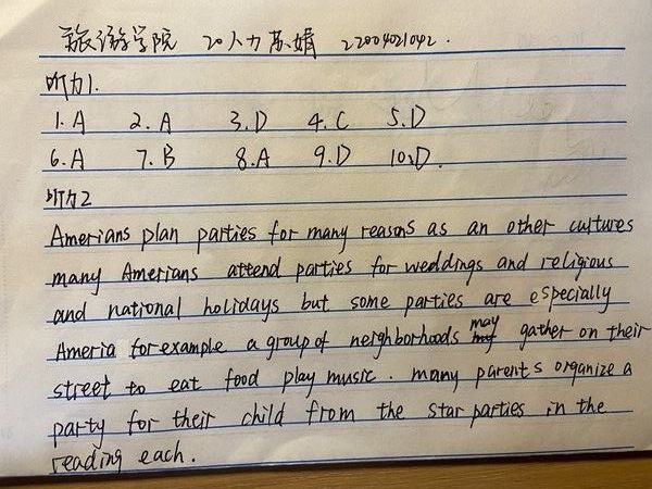 本次活动采取线上活动形式,参赛的同学需提前加入钉钉活动群,13:50工作人员在钉钉活动群中发布活动流程; 14:00发布第一部分听力内容题目;14:05发布第一部分听力材料;14:15发布第二部分听力材料; 14:30发布调查问卷,让同学们将答案拍照上传,即为活动结束。此次活动共收录120余份答卷。在众多参赛人员中,优胜者将会获得大学生英语俱乐部准备的精美礼品。