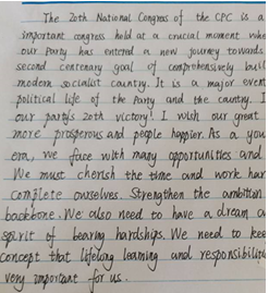 活动通过线上录制英文音频方式开展,以内容思想纵深度、语言表达流畅度、英文发音准确度三个方面作为评选依据。音频中班级同学表达了对二十大顺利召开的美好祝愿。经评审筛选,徐星宇、甘文静、张修宇、徐凡、陈沁5位同学的作品被评为优秀并在班级群进行展示。活动结束后同学们纷纷表示,青年应奋勇拼搏,为实现中华名族伟大复兴的中国梦贡献青春力量。