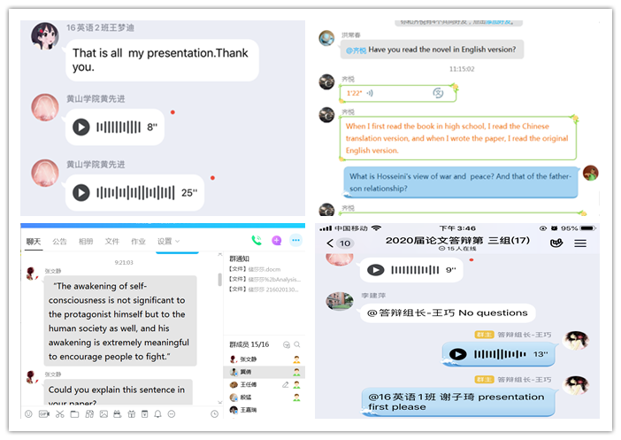 答辩学生以电子文档和语音的形式,在线上向答辩组教师提供答辩陈述,简要介绍论文的研究价值、研究目的、研究方法、中心论点以及创新之处等,并回答由答辩组教师提出的问题。答辩教师根据学生的论文质量、答辩陈述和回答问题的情况打分,并就学生论文定稿中存在的各种不足之处,对学生进行进一步指导。整个答辩过程紧张、有序,效果良好。毕业生们均表示,答辩过程是对自己毕业论文的再审视,对自己论文写作能力、外语应用能力的再打磨、再提升。