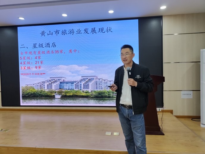 讲座伊始,张志宝简短介绍自己并分享了自己的求学经历。紧接着,张志宝从多层面详细介绍中国旅游业的发展趋势以及黄山市旅游发展现状,为同学们分析旅游业的就业前景。他建议同学们大学阶段要练好基本功、积极培养良好兴趣、主动参加各类考证、踊跃参加社会活动。最后,张志宝为大家详细讲解了旅游英语的未来职业方向,并表示希望同学们遵循内心,努力前行,找到适合自己的方向。