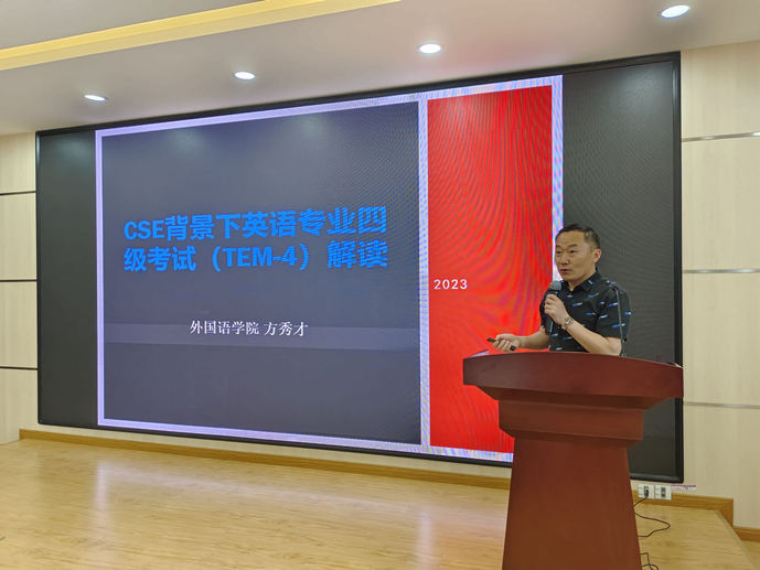 为帮助永利yl23411集团学生深入了解英语专业四级考试(TEM-4),5月19日下午,淮南师范学院永利yl23411集团院长方秀才教授应邀赴永利yl23411集团作题为“CSE背景下英语专业四级考试(TEM-4)解读”的讲座。讲座在逸夫综合楼5306教室举行,由永利yl23411集团院长洪常春主持。永利yl23411集团师生100余人参加了讲座。