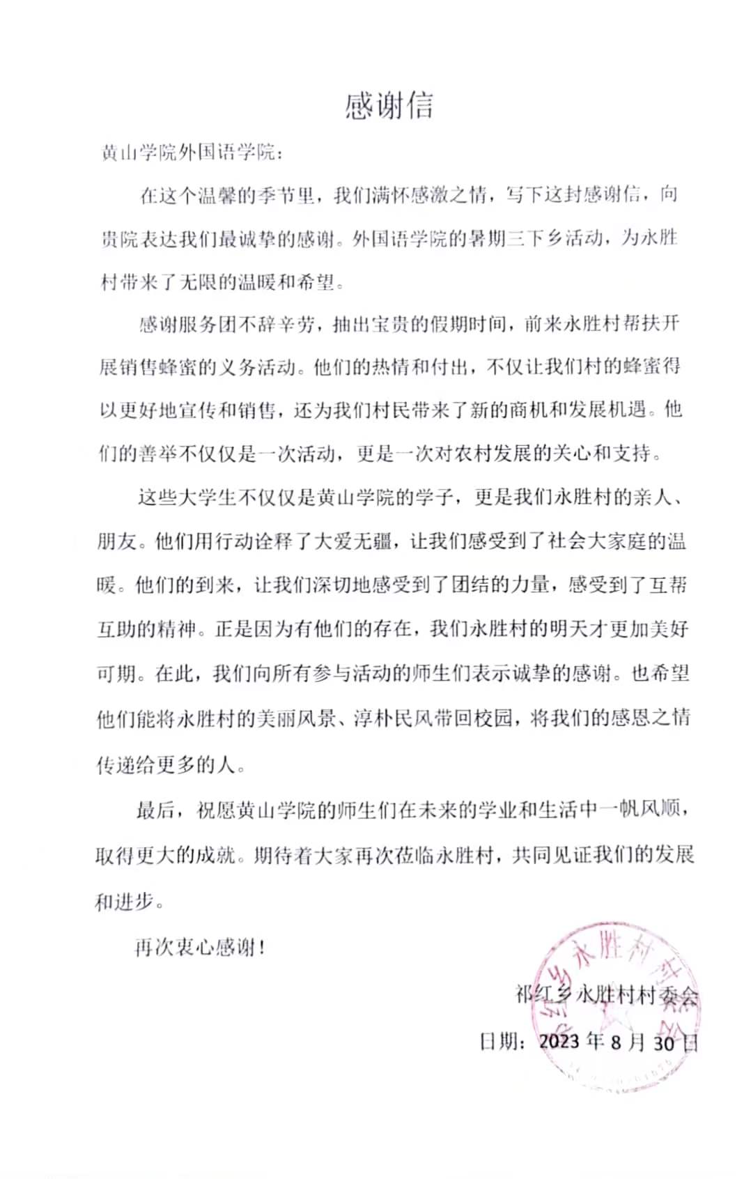 近日,祁红乡永胜村给我院发来感谢信,对我院永益农皖南红色乡村振兴服务团开展蜂蜜义卖活动期间的热情与付出表示感谢。信中指出,服务团主要协助永胜村进行蜂蜜的宣传和销售,不仅拓展了永胜蜜的销售渠道,也为当地带来了新的商业机会。感谢信同时对我院在此次暑期三下乡工作上的大力支持表示感谢。