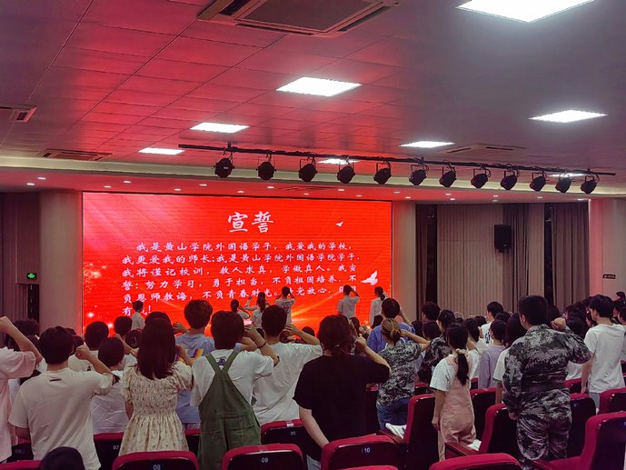 发言结束后,辅导员、班主任和教研室主任上台为六名新生代表佩戴校徽以及颁发纪念品,并举行集体宣誓仪式:“我宣誓:努力学习,勇于担当,不负祖国培养,不负恩师教诲,不负青春时光。请党放心,强国有我!”一句句铿锵有力的誓词,诠释了全体新生努力学习不懈奋斗的决心。