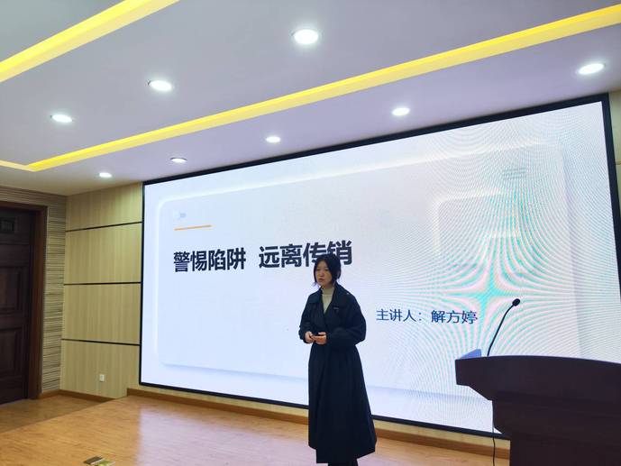 解方婷从传销的表现形式、传销的特点、传销的欺骗手段、以及目前网络新型传销套路等,围绕近年来大学生参与传销、害人害己的生动案例,介绍了传销活动的危害性与渗透趋势,教育学生远离陷阱、拒绝传销。
