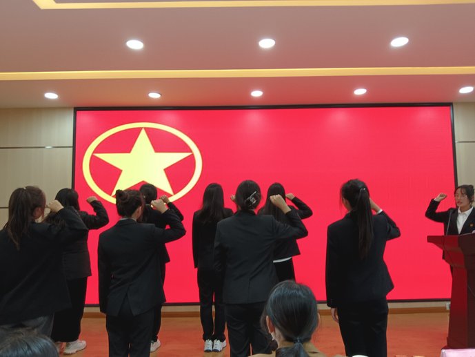 发言结束后,三位老师为新发展团员佩戴团徽。“我志愿加入中国共产主义青年团,坚决拥护中国共产党的领导”,在吴子叶的带领下,大家庄严宣誓,铿锵有力的誓词激荡着每一位同学的心。