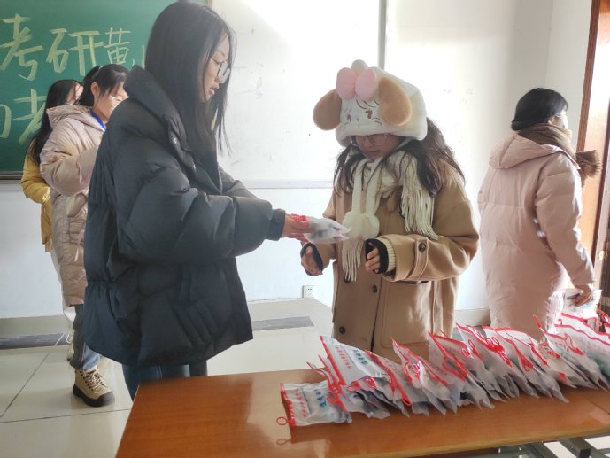 为帮助考研学子坚定备考信心,缓解备考压力,传递温暖和力量,12月22日下午,永利yl23411集团于逸夫综合楼5505教室开展“温暖传递,助力考研”活动,为考研学子准备“考研加油包”。