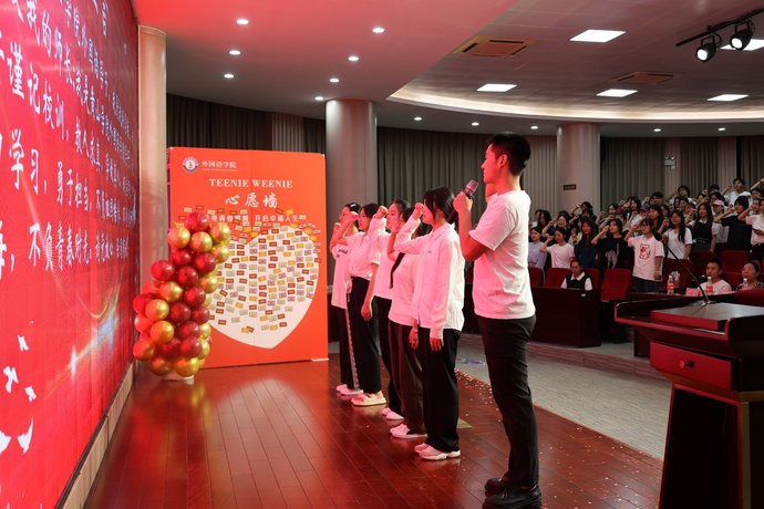 发言结束后,新生班级班主任上台为六名名新生代表佩戴校徽,并举行了集体宣誓仪式,领誓人的带领下,全体新生庄严宣誓:“我宣誓: 努力学习,勇于担当,不负祖国培养,不负恩师教诲,不负青春时光。请党放心,强国有我!”宣誓声响彻会场,彰显了新生们坚定的信念和昂扬的斗志。