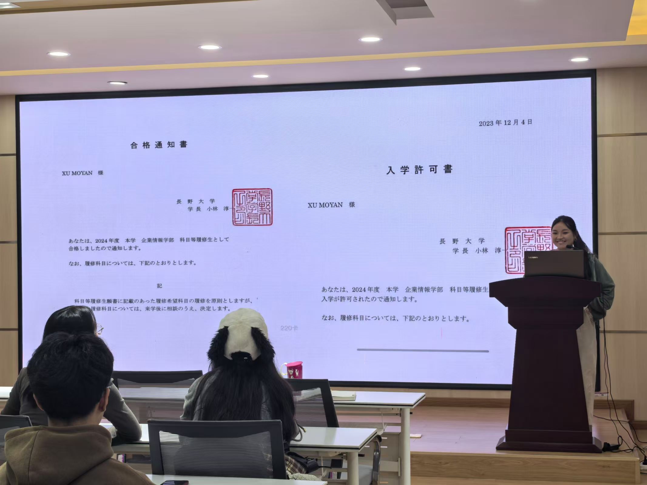 分享会上,来自21日语2班的徐莫言同学与22日语1班的李文雅同学担任主讲嘉宾。她们借助生动的照片和细腻的文字,全方位、多角度地展现了日本长野大学的风采,内容涵盖了生活点滴、学习体验、旅行见闻、气候特色及特色美食等,极大地激发了同学们对交换留学的热情与向往。两位同学还详细分享了她们的选课经历、课堂上的趣事以及在日本的生活点滴,通过镜头带领大家领略了长野大学美丽的校园环境。此外,她们还深入介绍了日本的饮食文化、风俗习惯,并动情讲述了加入校乒乓球社团后与国际友人结下的深厚友谊。