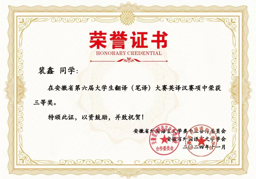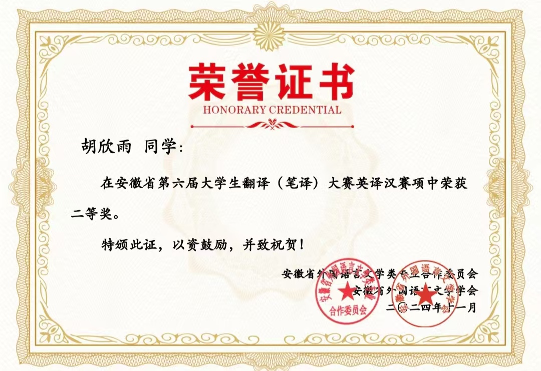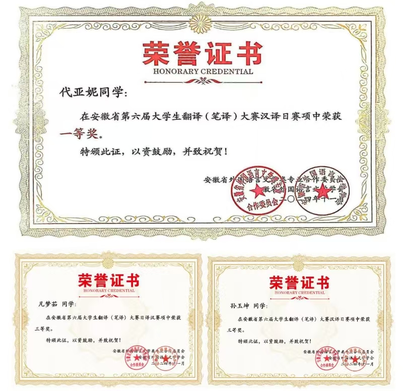11月16日-17日,安徽省第六届大学生翻译(笔译)大赛决赛在阜阳师范大学举行。永利yl23411集团五名学子在此次比赛中荣获佳绩,在汉译日赛项中,21日语1班代亚妮(李艳指导)获一等奖,22日语2班孙玉坤(张亚璐指导)获三等奖;在日译汉赛项中,23日语1班凡梦茹(李艳指导)获三等奖;在英译汉赛项中,胡欣雨同学荣获二等奖,裴鑫同学在英译汉比赛中获三等奖,指导教师均为童兆升。童兆升、李艳、张亚璐获“优秀指导教师奖”。
