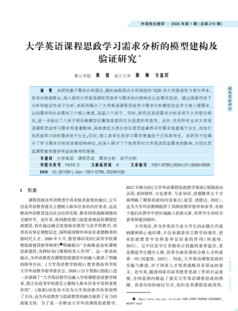 冀倩的论文《大学英语课程思政学习需求分析的模型构建及验证研究》,依托需求分析理论,选取了1520名大学英语学习者作为研究样本,通过问卷调查法,运用探索性因子分析和验证性因子分析,揭示了大学英语课程思政学习需求分析模型的三个核心维度:学习者心理需求、认知需求和社会需求,共涵盖八个因子。研究发现,这些需求分析因子之间存在密切关联,进一步证实了八因子相关维模型在聚敛效度和区分效度上的有效性。此外,研究还指出性别和专业对大学英语课程思政学习需求有显著影响。该研究不仅揭示了学习需求分析的多维结构特征,还深入分析了个体差异对大学英语思政需求的影响,为优化思政课程教学提供了宝贵的参考和借鉴。