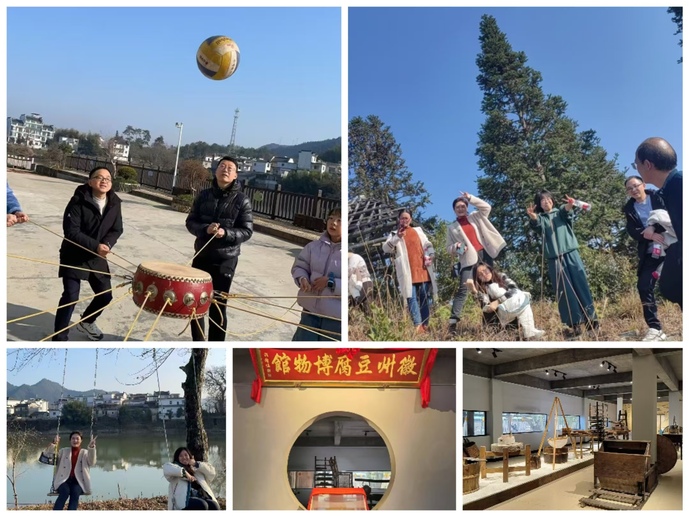 月芽山庄位于休宁县五城镇星洲村,地处率水之滨,虽在山野,但绝非寂寥;白墙黛瓦的徽州古村落依河而建,气质出众,风景如画,植被丰饶,青山绿水宛若天空之镜。老师们在园区内的拓展基地分组进行趣味运动会。沙包对抗赛与同心鼓挑战激发了团队协作意识,跳绳和飞镖比赛则展现出大家的体育竞技潜能,现场掌声与欢笑声此起彼伏。随后的自由活动时间,大家参观了位于山庄旁边的豆腐博物馆,体验学习了豆腐制作工序、了解豆腐文化,有的老师还品尝了当地农户自酿的米酒。部分教职工选择漫步古村落,感受乡村生态文化;另有小组选择爬山登高望远,享受大自然的宁静与美丽,以期来年追求更高目标和以更加饱满的精神状态迎接工作和生活的挑战。