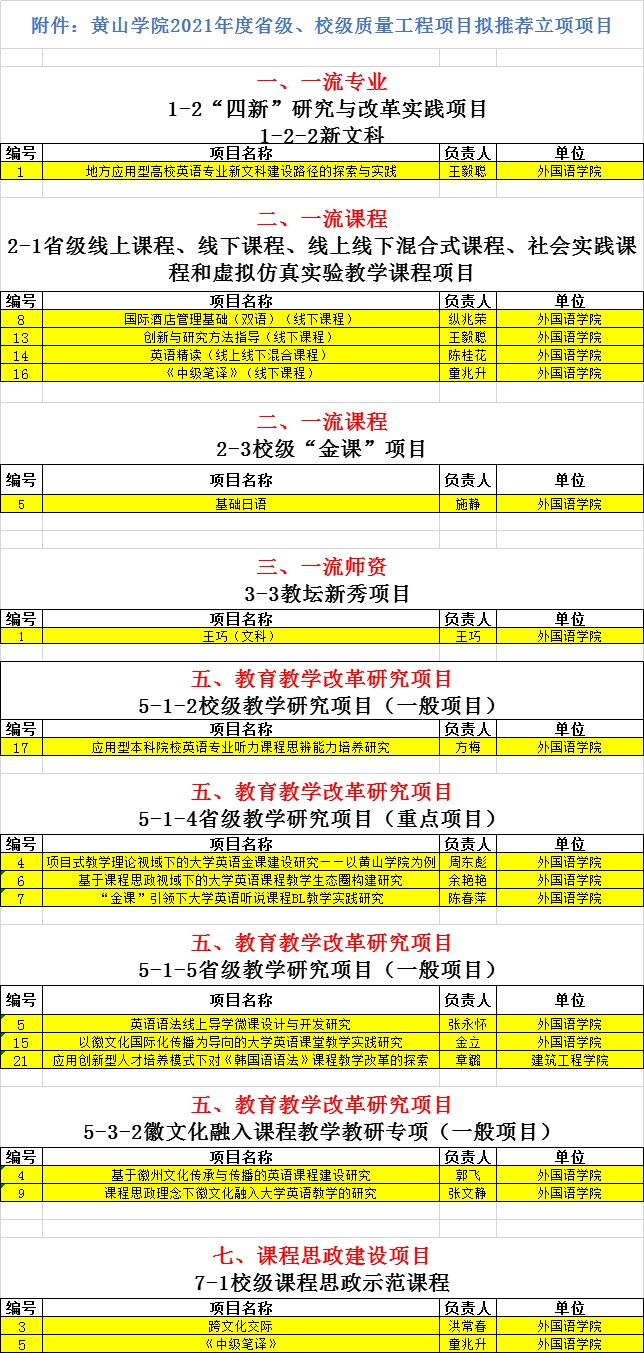 7 | 校级 | 五类 | 2015 | yl23411集团校级科研项目 | 基于功能翻译理论的徽州饮食民俗英译研究 | 王巧 |